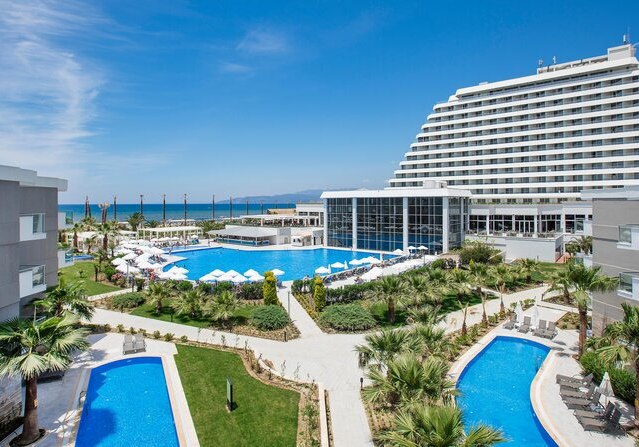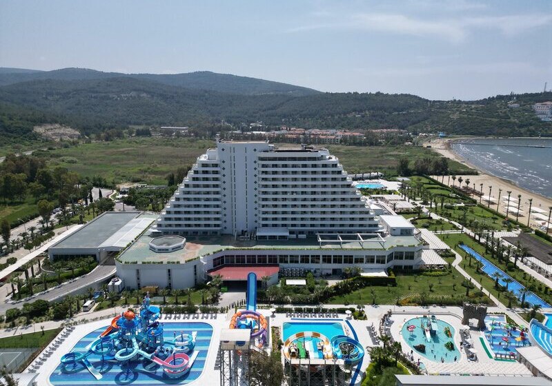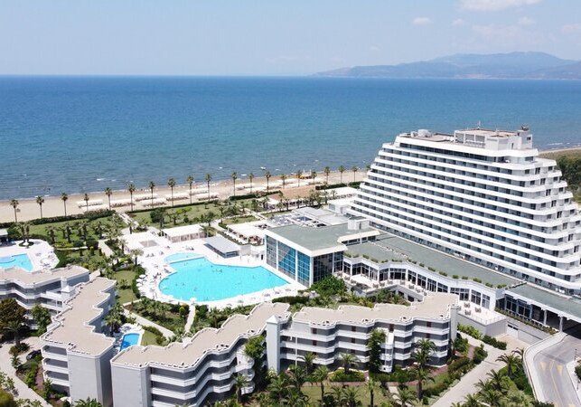 Im Palm Wings Ephesus Beach Resort trefft Ihr auf eine weitläufige Ferienanlage, die direkt am Sandstrand liegt und mit modernisiertem Auftritt seit 2017 auftritt. Breite Poolflächen mit Wasserrutschen, großzügige Liegebereiche und klare Linien prägen die Atmosphäre. Familien, Strandurlauber und aktive Paare finden hier Raum für entspannte Tage und lebhafte Abende.