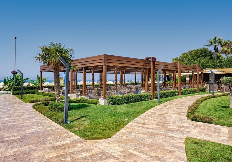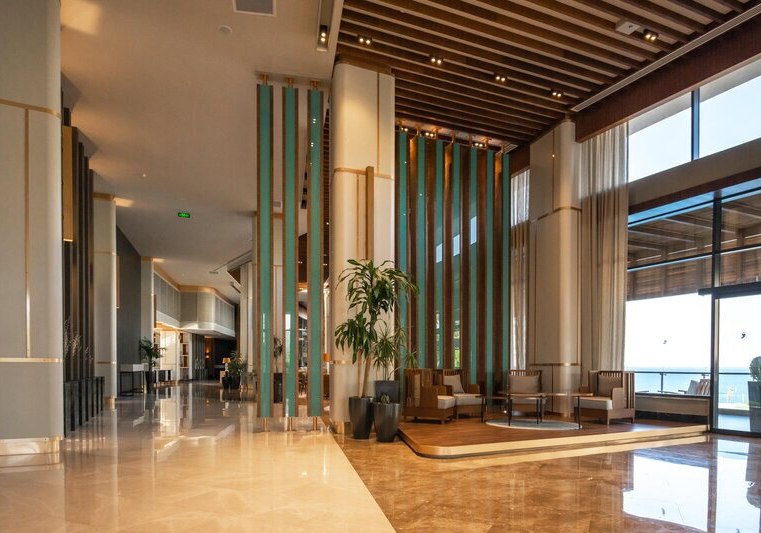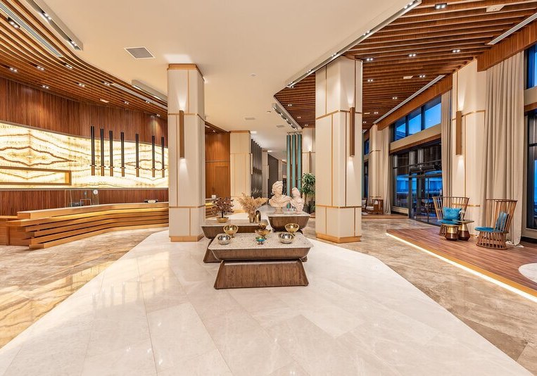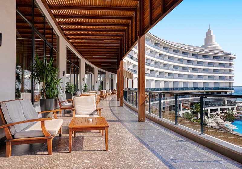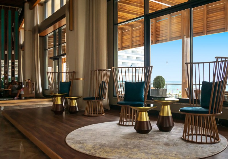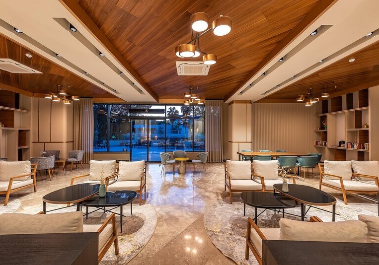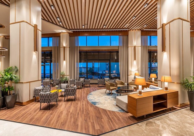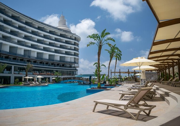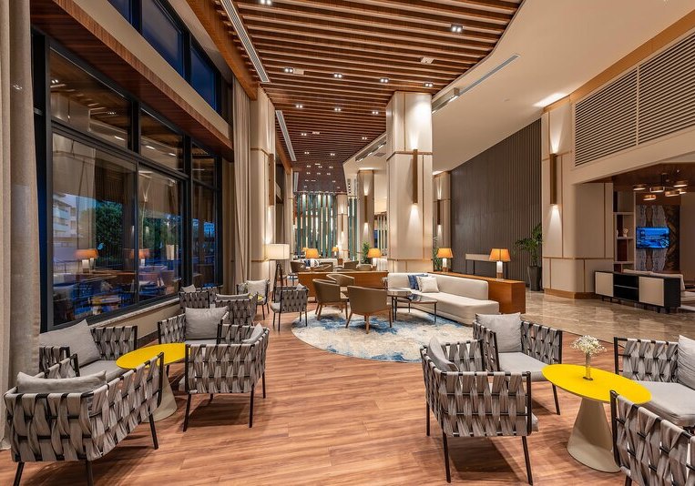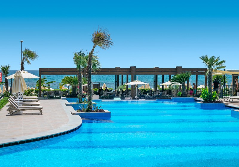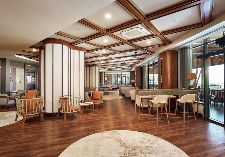 Das 2021 eröffnete Haupthaus mit neun Etagen bündelt Lobby, Rezeption und Loungeflächen mit WLAN im gesamten Bereich. Draußen verbinden Garten und Sonnenterrassen den großen Süßwasserpool mit separatem Kinderbecken; am Strand wie am Pool warten Liegen, Schirme und Badetücher.