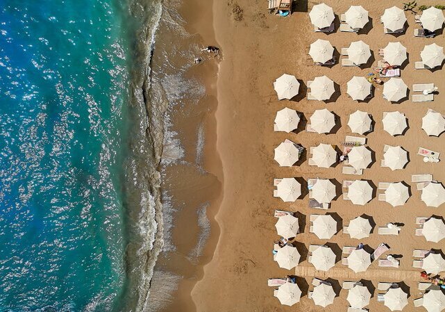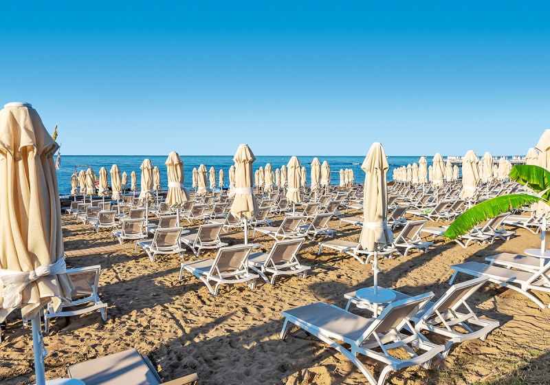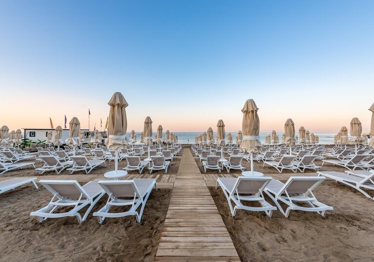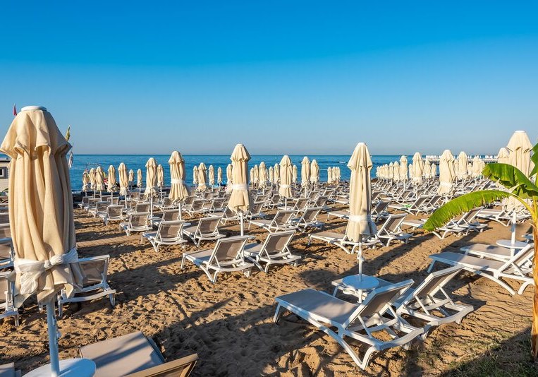 - Strandsetup: Liegen, Schirme und Handtücher sind am Strand bereitgestellt.