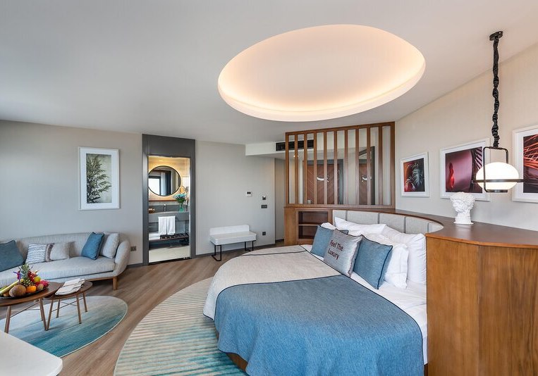 Zur Wahl stehen Meer- oder seitlicher Meerblick, Swim-up-Zimmer mit direktem Poolzugang, Familienzimmer mit Verbindungstür und separatem Schlafzimmer, teils mit zwei Bädern, sowie Deluxezimmer mit Whirlpool und Liegestühlen auf dem Balkon. So richtet Ihr Euren Rückzugsort exakt nach Euren Plänen aus.