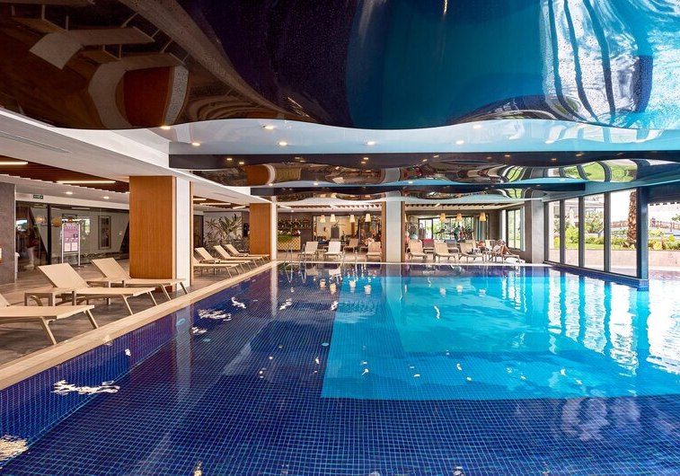 Im Wellness-Center kombiniert Ihr türkisches Bad, Sauna und Dampfbad mit klassischen Spa-Angeboten. Das Hallenbad (235 m²) ergänzt ruhige Bahnen und wetterunabhängiges Schwimmen, zusätzlich gibt es ein Kinderbecken im Indoor-Bereich.