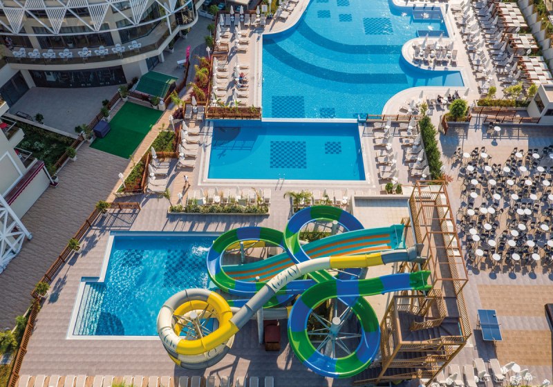 Drei fünfgeschossige Häuser mit Aufzügen bilden den Rahmen, die Wege bleiben klar. Rezeption, WLAN in Anlage und Zimmern sowie Strandhandtücher vereinfachen den Tag. Pools strukturieren die Außenbereiche: Kinderbecken, Relaxpool und ein Pool mit drei Wasserrutschen setzen unterschiedliche Schwerpunkte. Highlight: Wasserrutschen bringen Tempo in warme Nachmittage.