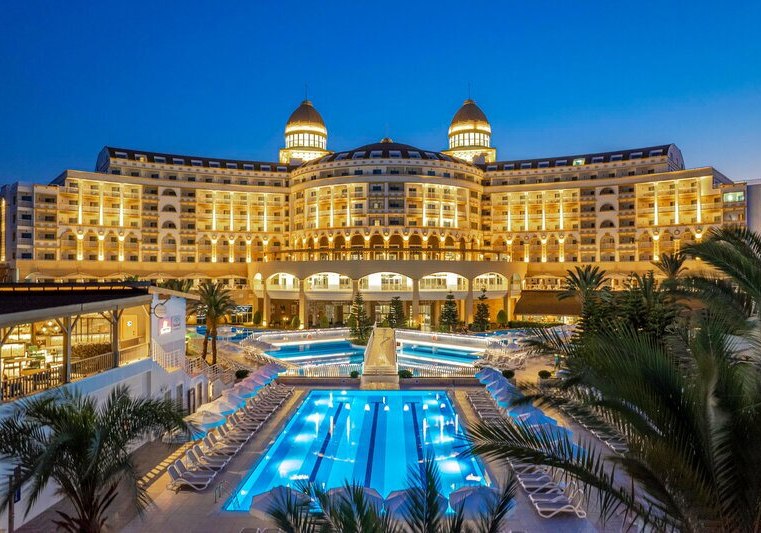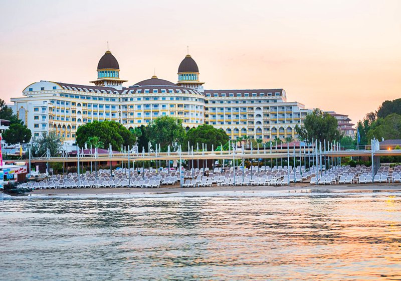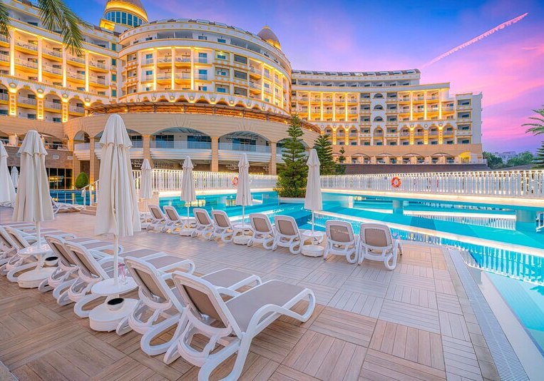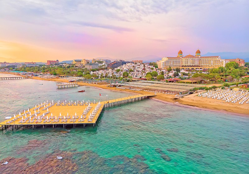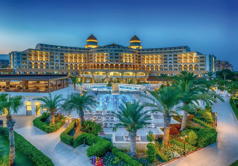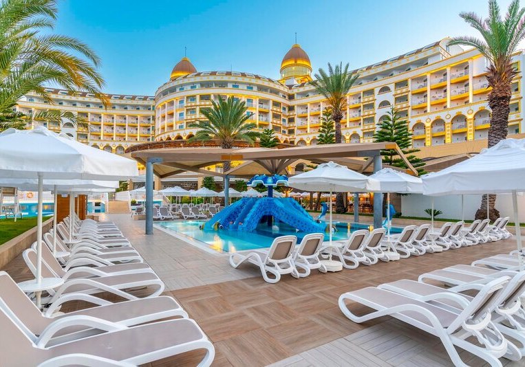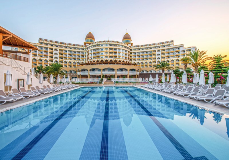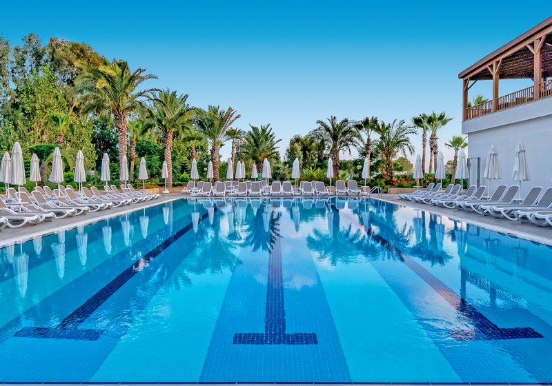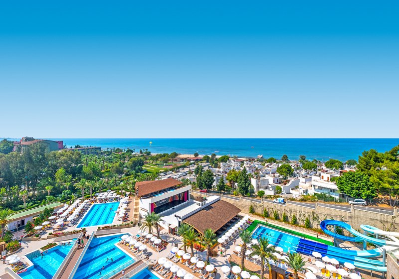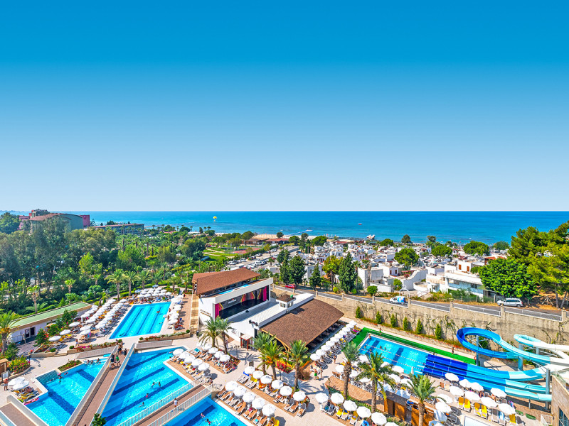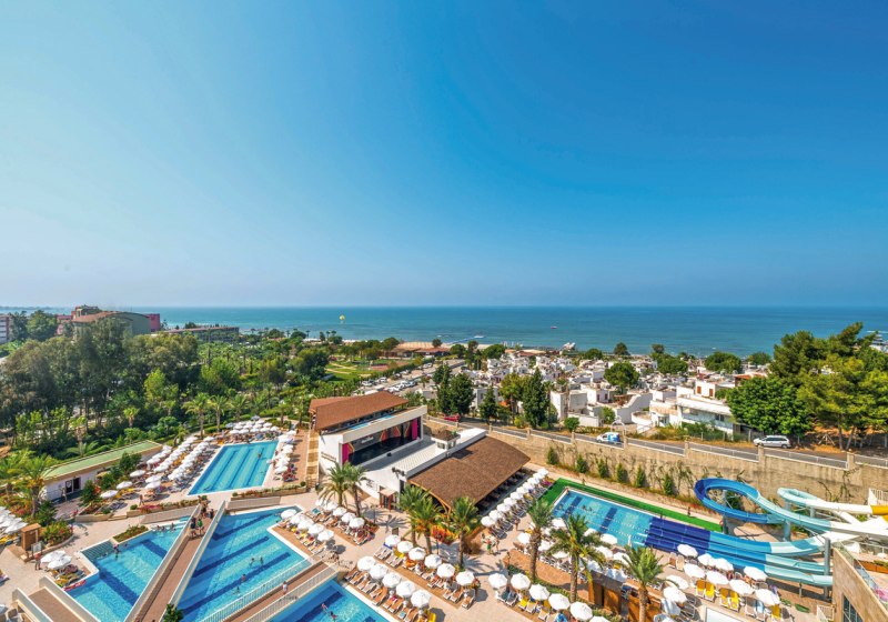 Zwischen Süßwasserpool mit drei Wasserrutschen, ruhigen Innenbereichen und professionell geführten Restaurants entsteht ein runder Rhythmus aus Aktivität und Ruhe. Abends locken Shows und Live-Musik, später die hauseigene Diskothek. Wer Abwechslung sucht, erreicht Side nach rund 5 Kilometern. Highlight: Vielfältige Tagesstruktur von Pool bis Abendshow.
