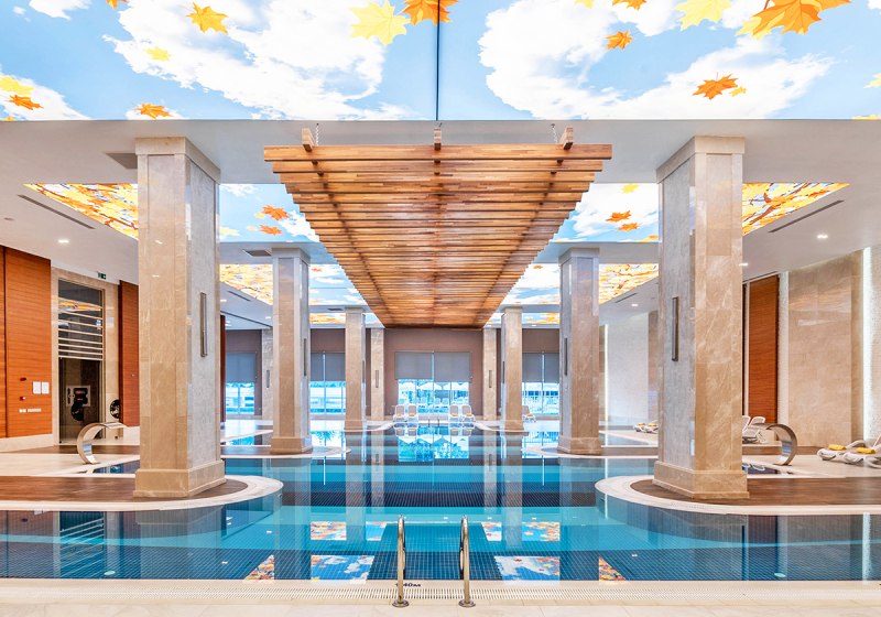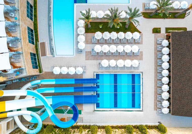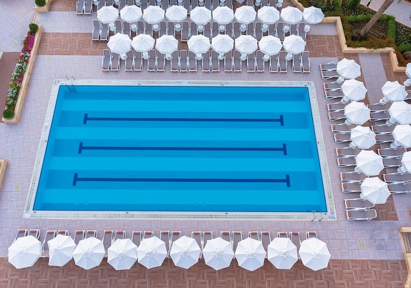 • Liegestühle • Hallenbad • Außenpool • Sonnenschirme • Poolbar • Sonnenterrasse • Badetücher • Wasserrutsche • Pool