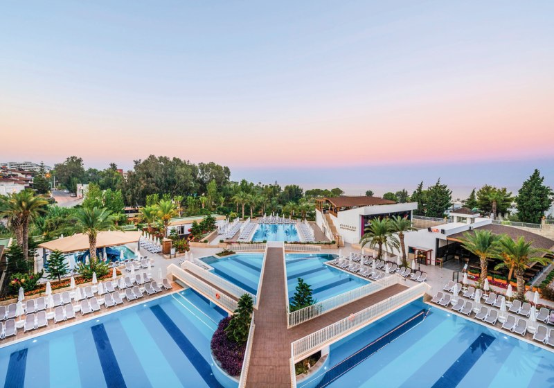 Die Infrastruktur ist umfassend: WLAN in der gesamten Anlage, drei Außenpools mit Süßwasser und Wasserrutschen, zwei Hallenbäder, Fitnessraum und mehrere Bars. Sonnenliegen, Schirme und Badetücher erhaltet Ihr an Pool und Strand. Das Herz der Abende schlägt im Theatersaal. Highlight: Drei Wasserrutschen am Süßwasserpool.