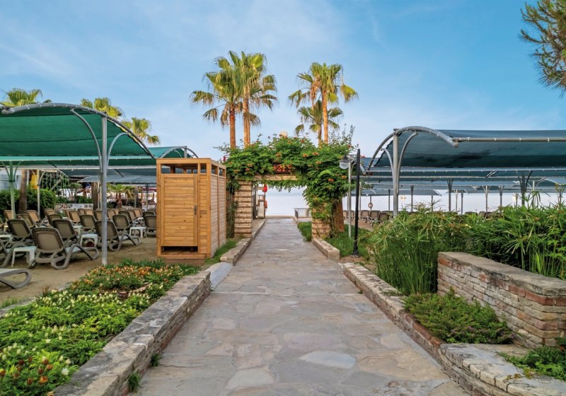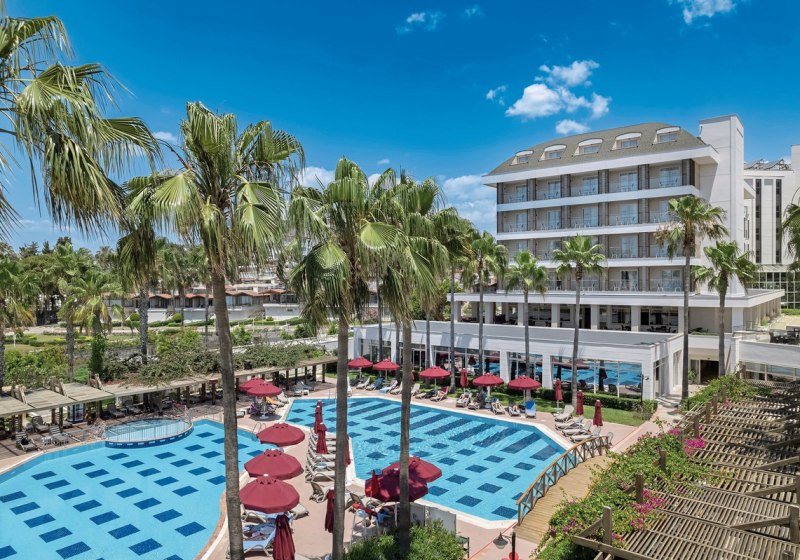 Trendy Palm Beach empfängt Euch als stilvolles Adults-only-Refugium ab 16 Jahren in Side. Vier Gebäude mit 320 Wohneinheiten rahmen Garten, Sonnenterrasse und eine weitläufige Süßwasser-Poollandschaft mit Wasserrutschen. WLAN in der gesamten Anlage hält Euch verbunden, während Ihr am hoteleigenen Sandstrand zwischen Liegen, Auflagen und Sonnenschirmen ankommt. Highlight: Adults-only-Konzept ab 16 Jahren sorgt für fokussierte Ruhe am Meer.