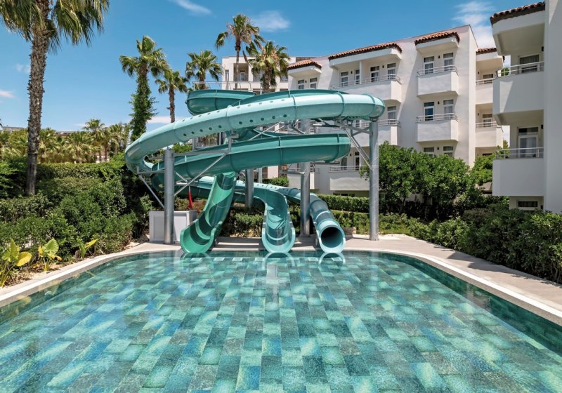 • Rutschen-Spaß: Drei Wasserrutschen ergänzen die Süßwasser-Poollandschaft.