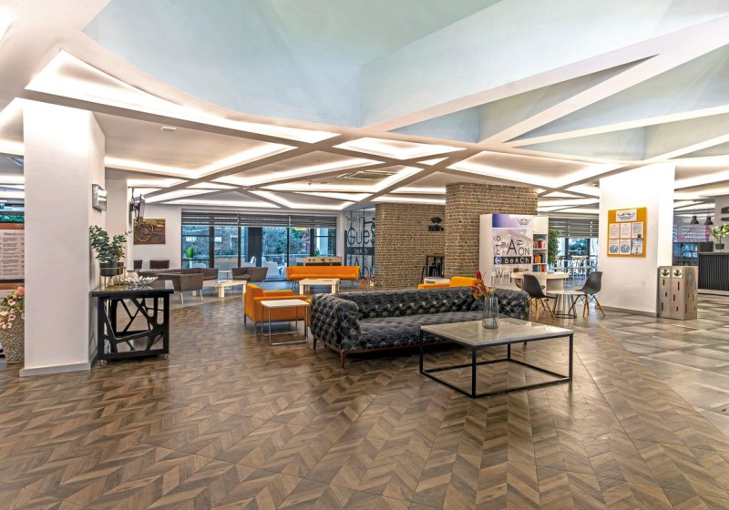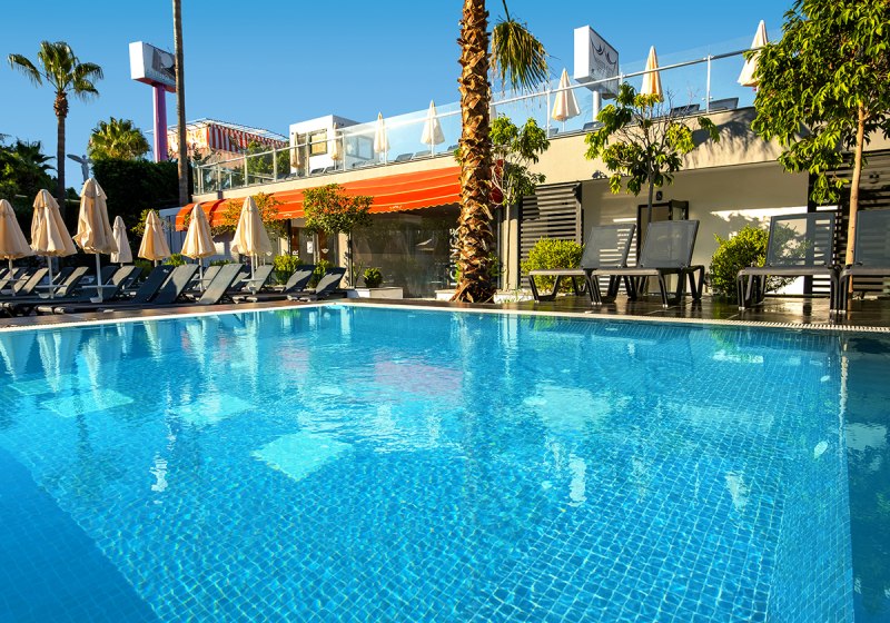 Die öffentlichen Bereiche sind funktional organisiert: Rezeption und Lobby mit Sitzgruppen, Lift, Konferenzraum und Shops. WLAN ist in Lobby und Zimmern inklusive. Draußen erwartet Euch ein 250-Quadratmeter-Außenpool, zwei Wasserrutschen, Sonnenterrassen sowie Liegen, Auflagen, Schirme und Badetücher am Pool und am Strand.