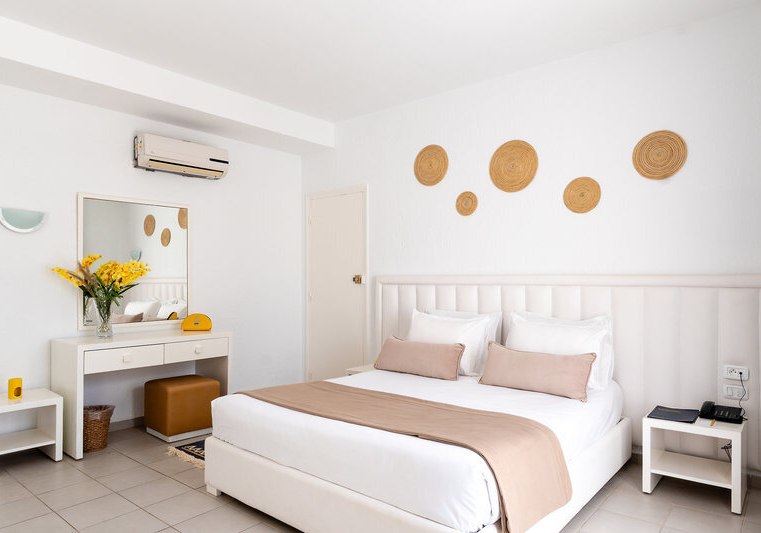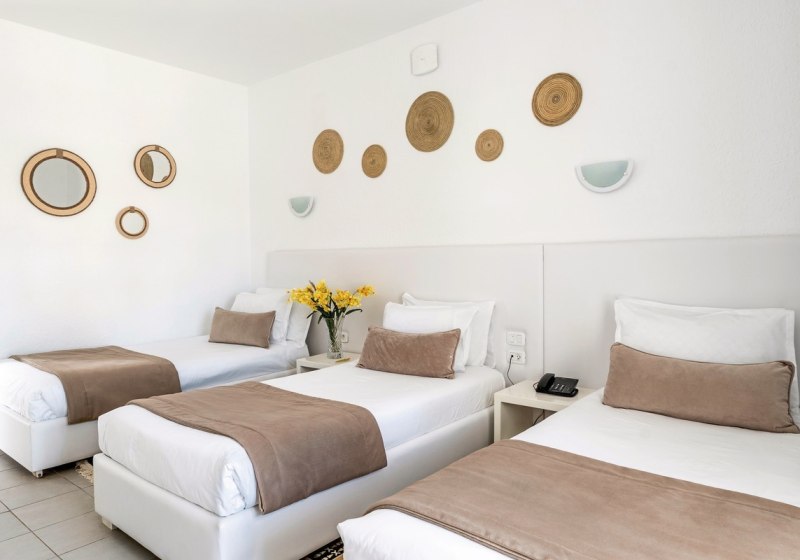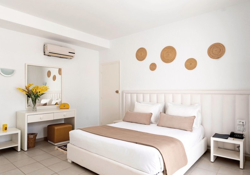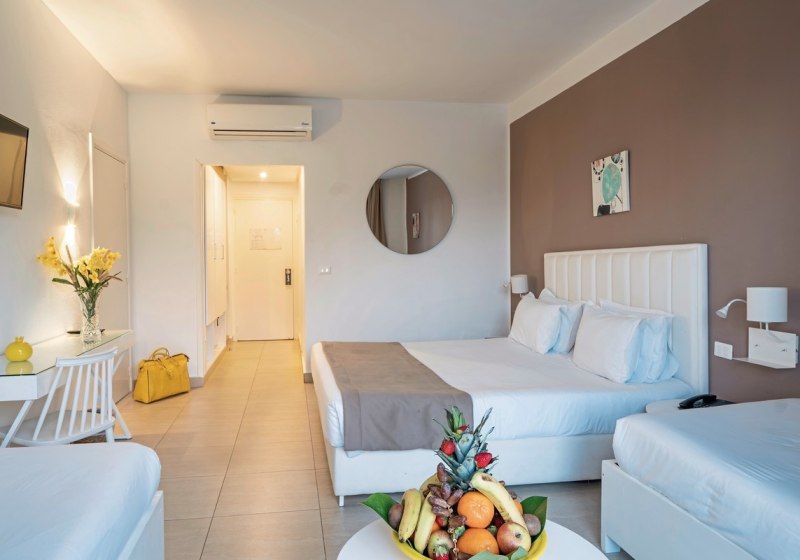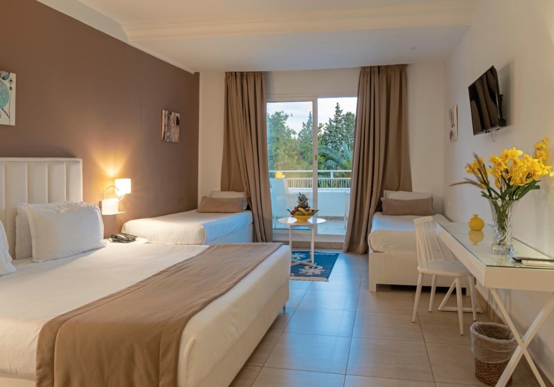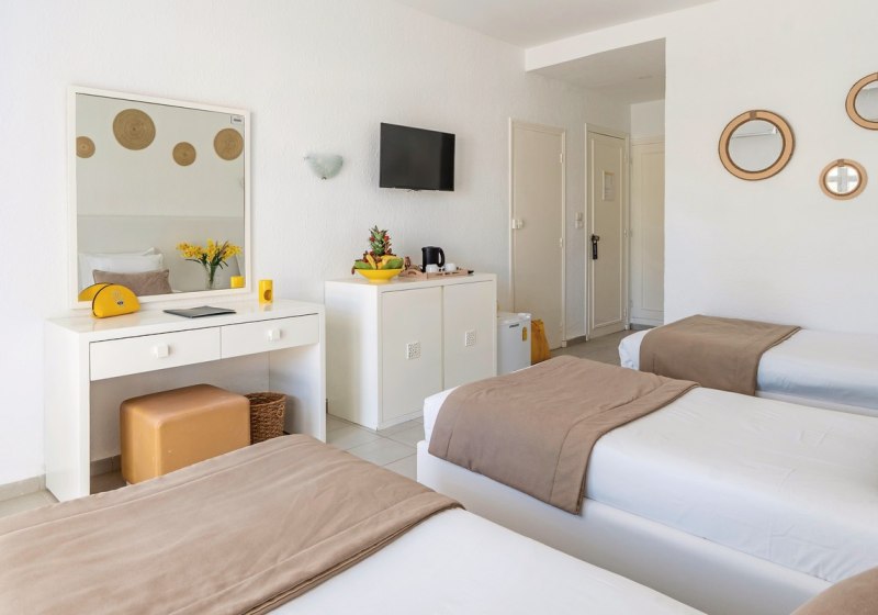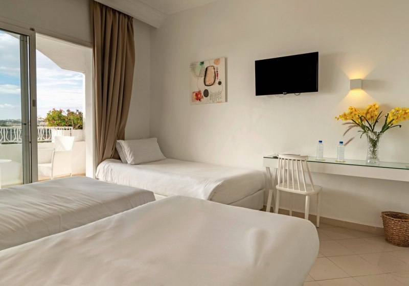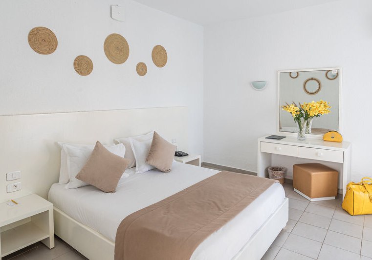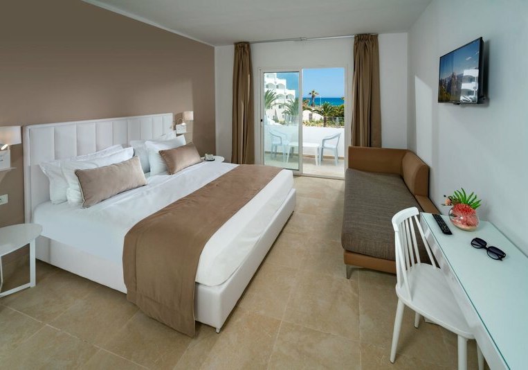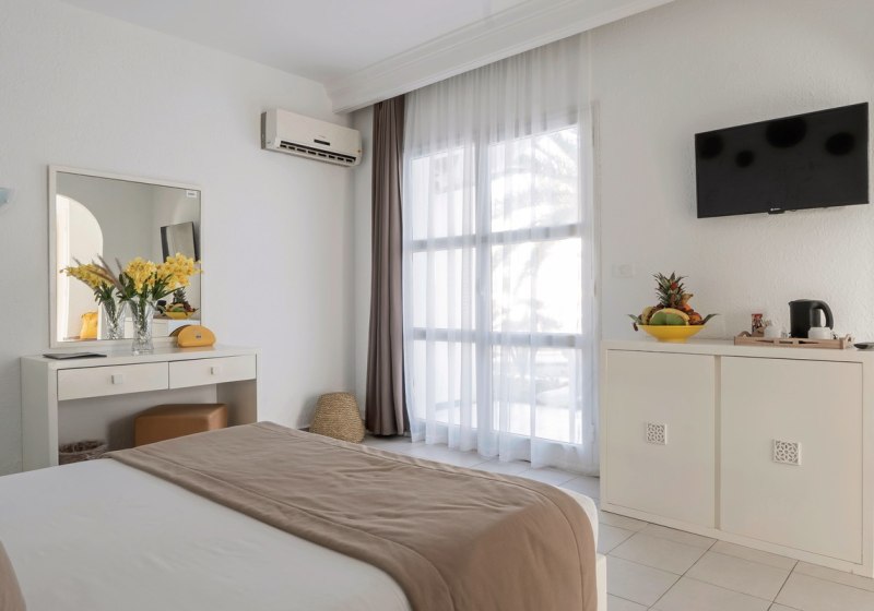 Ihr wählt zwischen Doppelzimmern, Super-Sparzimmern, Bungalowzimmern und Familienzimmern. Ausgewählte Familienzimmer kombinieren ein Kingsize-Bett mit zwei Einzelbetten. Zur Grundausstattung zählen Bad/WC, Föhn, Klimaanlage, Telefon, Minibar, Sat-TV sowie Balkon oder Terrasse; Safes stehen gegen Gebühr bereit.