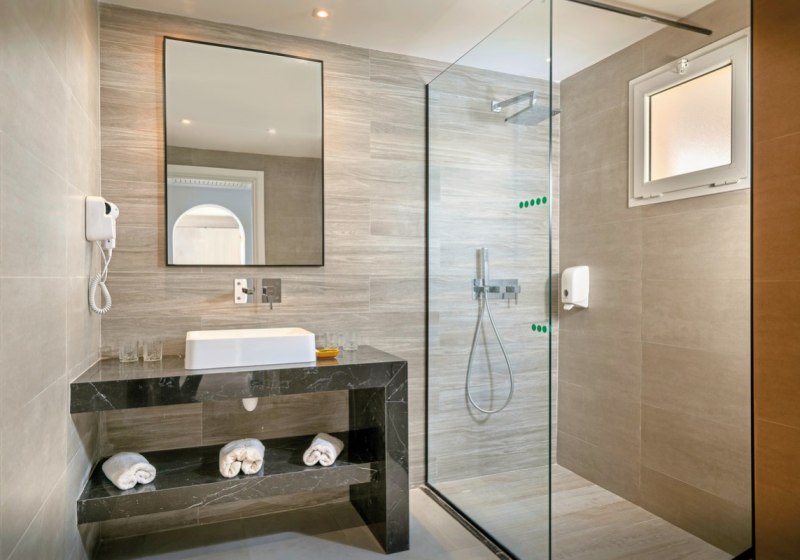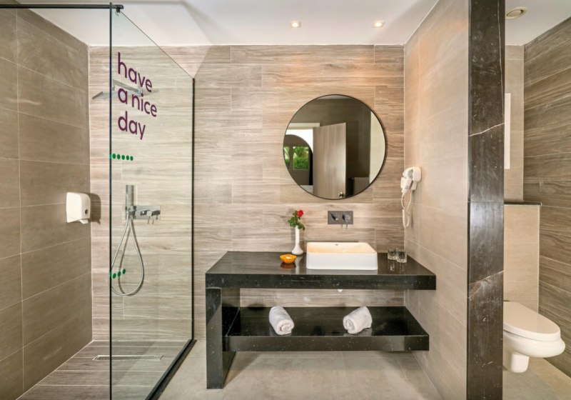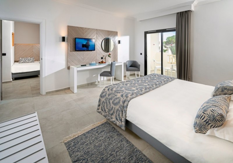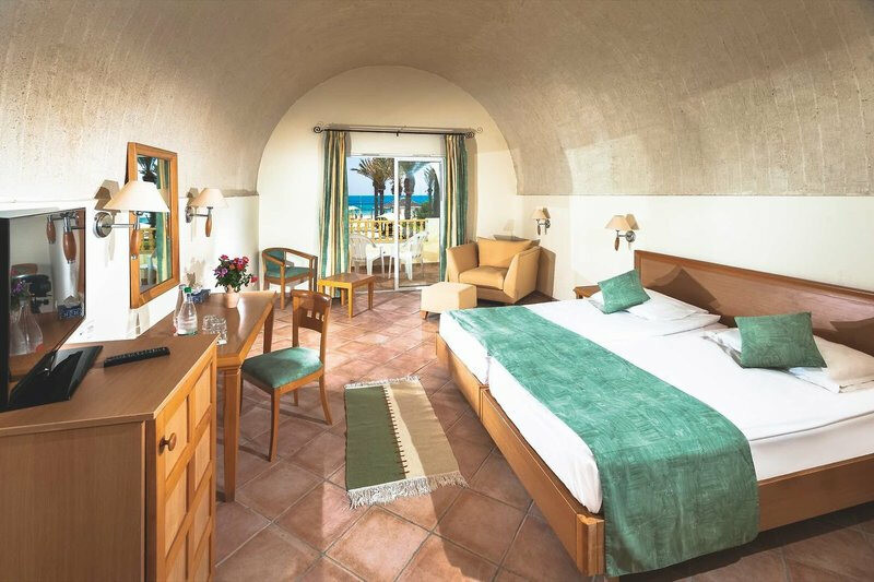 Die Zimmer bieten Dusche/WC, Föhn, Telefon, Klimaanlage, Sat‑TV, kostenfreien Safe und Minikühlschrank. Balkon oder Terrasse öffnet den Blick in die Garten- oder Poolbereiche; einige Zimmer verfügen über Pool- oder seitlichen Meerblick. Das Design setzt auf klare Funktionalität, damit Ihr Euch schnell orientiert und entspannt ankommt.