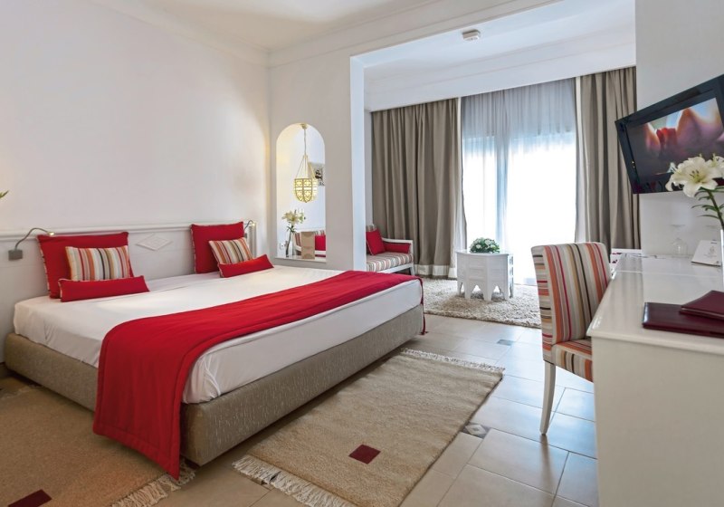 Ihr wohnt in Reihenbungalows mit 145 Zimmern, jeweils etwa 35 m² groß. Die Ausstattung ist durchdacht: Bad und Dusche/WC, Bademäntel, Klimaanlage/Heizung, Telefon, Sat-Flatscreen-TV, Minibar, Safe und WLAN inklusive, dazu Föhn. Ein Balkon oder eine Terrasse öffnet den Blick in die Anlage und schafft private Rückzugsorte zwischen Strand und Restaurant.