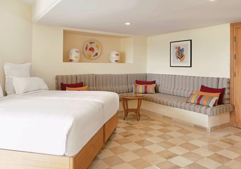 Für mehr Raum wählt Ihr Juniorsuiten mit etwa 75 qm, separatem Wohnraum und Gartenblick. Suiten mit rund 92 qm bieten zusätzlich zwei Badezimmer und Meerblick. Familienzimmer und Außenmöbel auf den Balkonen geben Euren Tagen Struktur, ob Ihr Euch zurückzieht oder den Blick nach draußen holt. Dusche und Badewanne sind je nach Kategorie verfügbar.