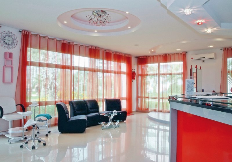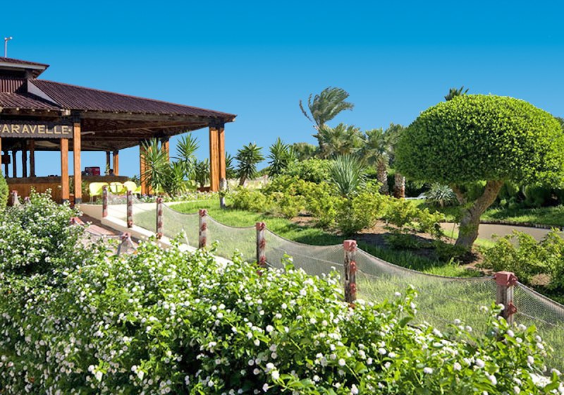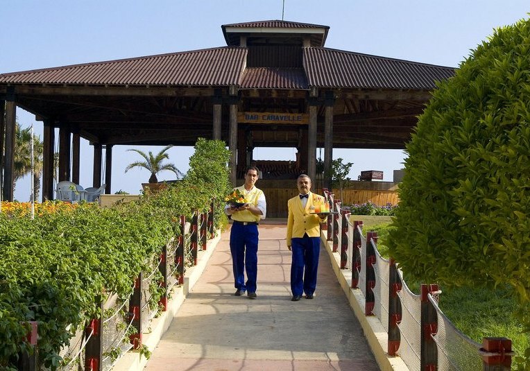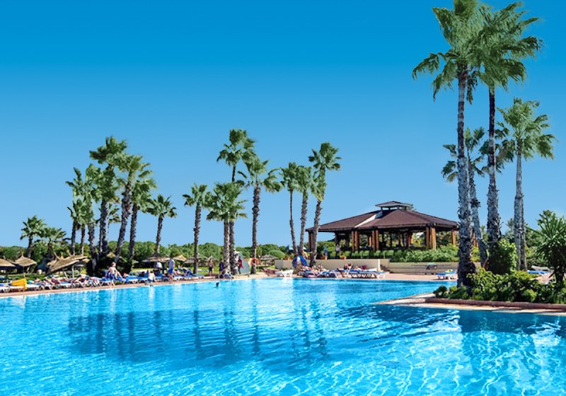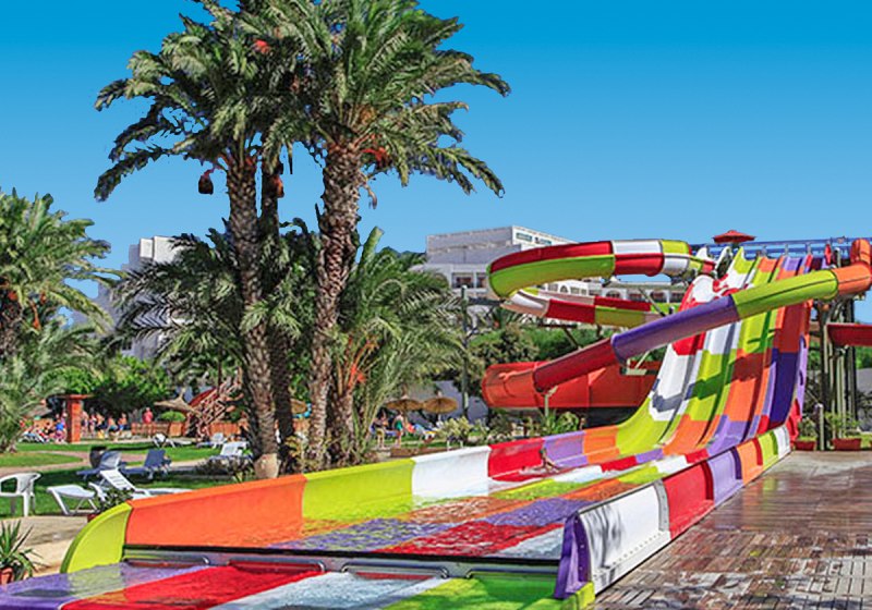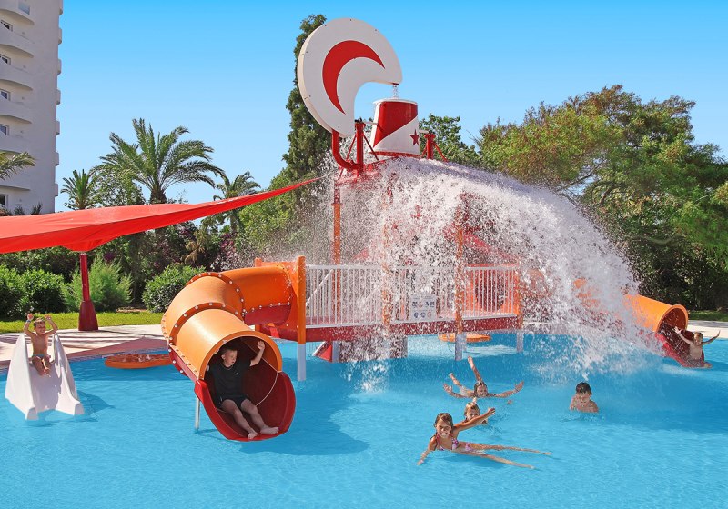 Die Anlage ist groß gedacht: 1.005 Zimmer in drei Gebäuden, Lifts, eine großzügige Lobby mit Rezeption und Mietsafes, Souvenirshops, Supermarkt sowie Garten- und Terrassenbereiche. Drei Außenpools plus Aquapark mit 12 Rutschen – sechs für Kinder, sechs ab 12 Jahren – setzen starke Wasserakzente.