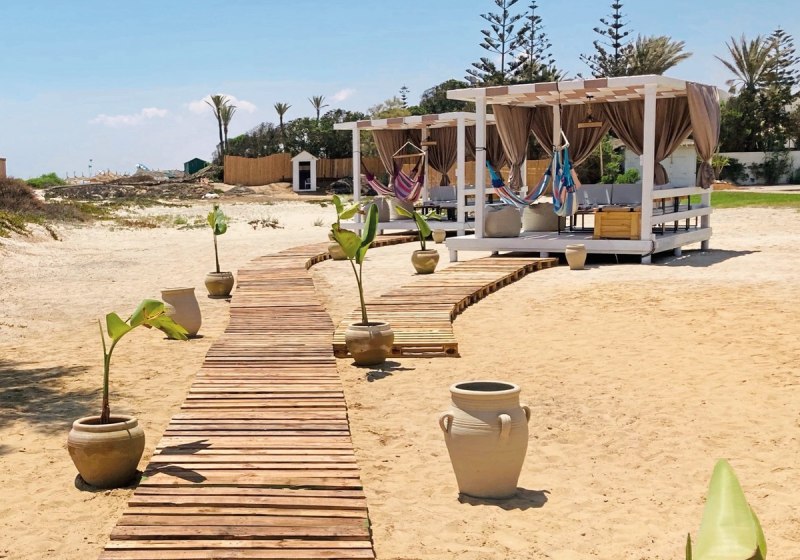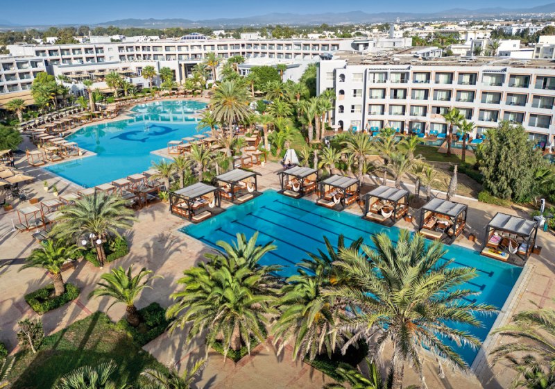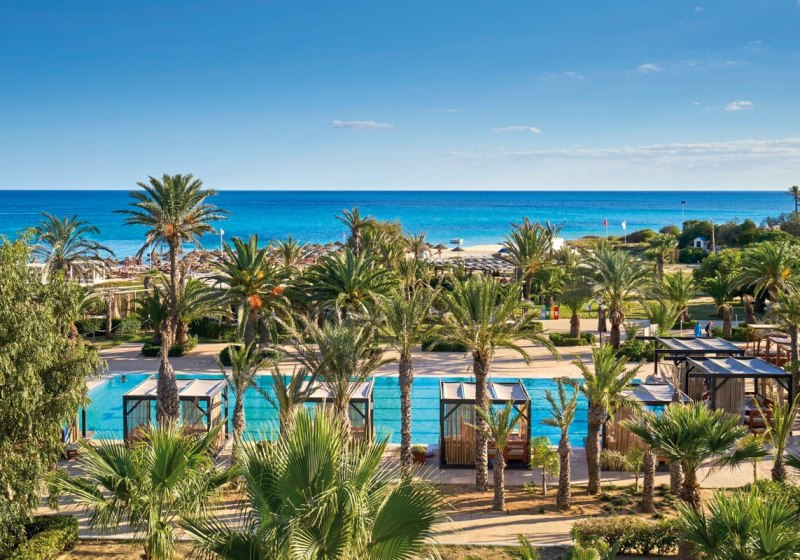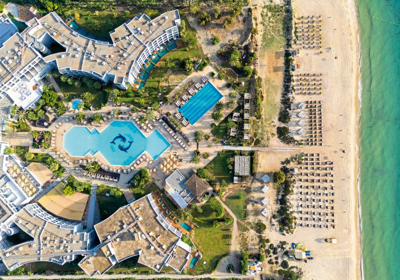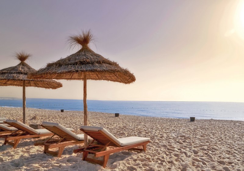 Ihr wohnt direkt am eigenen Sandstrand von Hammamet-Yasmine. Der Blick geht aufs Meer, die Wege bleiben kurz: von der Sonnenterrasse über den Pool hinunter an die Küste. Zur Altstadt von Hammamet sind es etwa 8 Kilometer – ideal für einen Ausflug zwischen Medina-Gassen und Küstenpanorama, bevor Ihr zurück an den Strand kehrt.