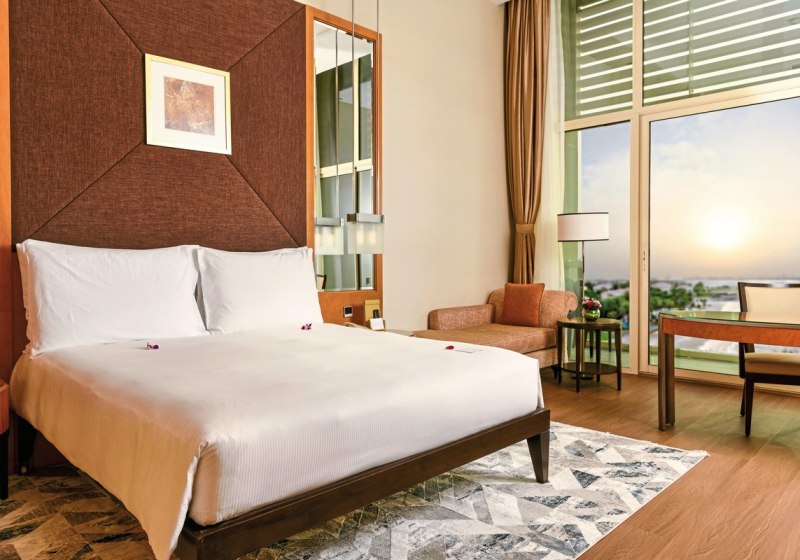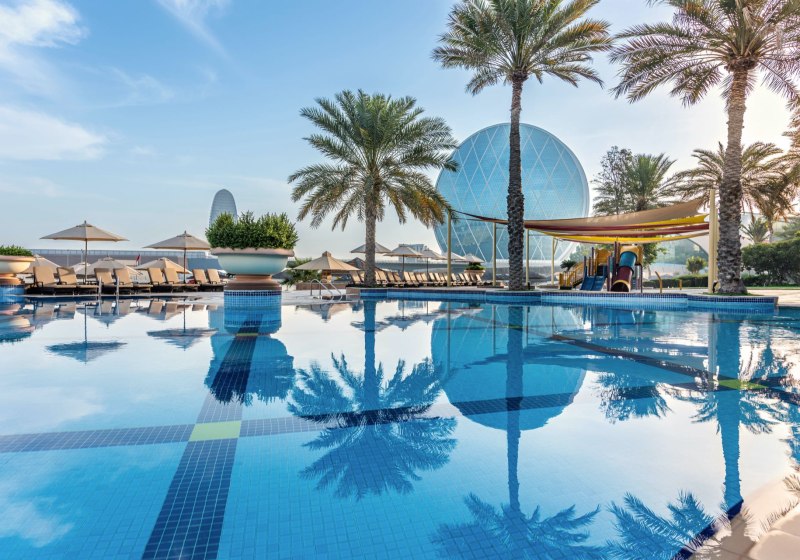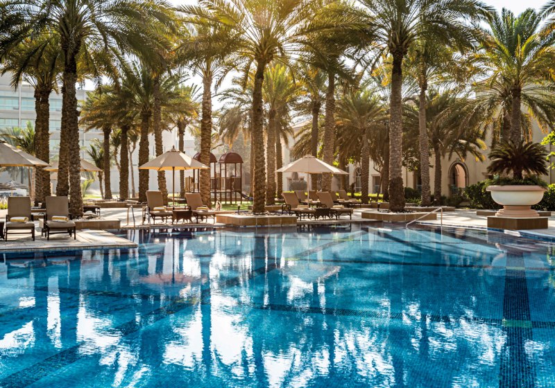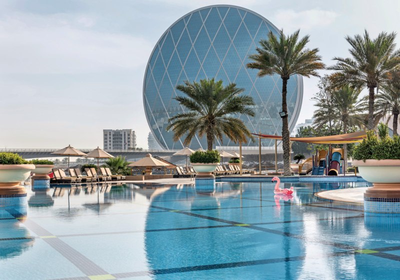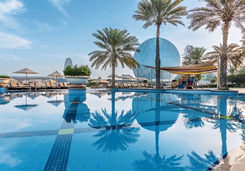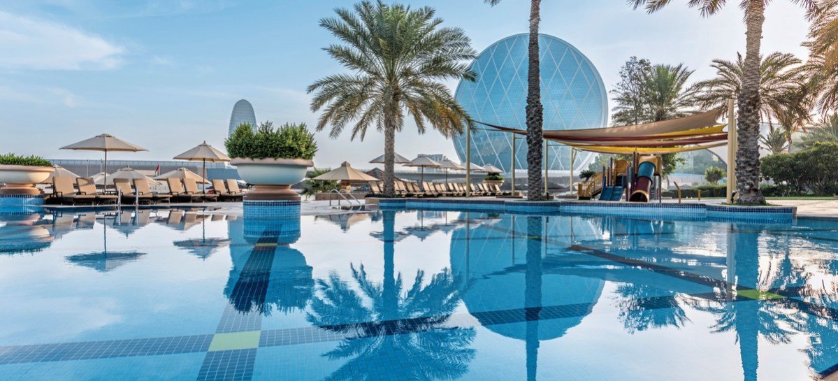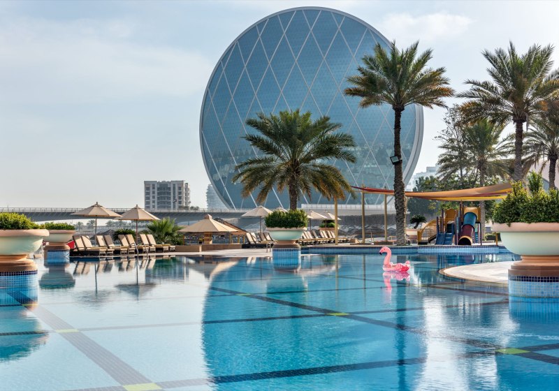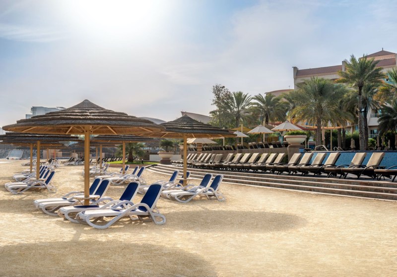 Die Wege ins Umland sind klar: Abu Dhabi Airport liegt rund 10 Kilometer entfernt, die Stadt etwa 20 Kilometer. Zum Abu Dhabi Golf Club sind es ungefähr 8 Kilometer. So plant Ihr Ausflüge präzise, ohne den Komfort der Strandlage aufzugeben. Highlight: Privatstrand & Pools. Privater Strand und zwei Außenpools bestimmen Euren entspannten Rhythmus.