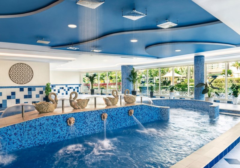 Der Wellness‑Kern ist vollständig: zwei Außenpools, Kinderbecken, Hallenbad und Whirlpool strukturieren den Tag am Wasser. Sauna, Dampfbad und Hamam bilden die ruhige Achse für Regeneration nach Sport oder Strand. Der Spa‑Bereich ergänzt mit Anwendungen, die Ihr passend zu Eurem Ablauf bucht.