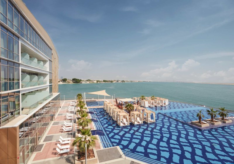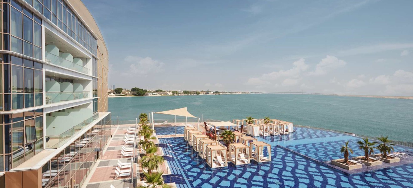 Im Royal M Hotel by Gewan Abu Dhabi wohnt Ihr direkt an der Al Bateen Marina – mit Wasser vor der Tür, weitem Blick über die Stege und einer Atmosphäre, die urbane Energie mit entspanntem Hafenflair verbindet. Der großzügige Infinity-Pool mit integriertem Kinderbereich bildet das Herz der Anlage, während Cabanas über dem Wasser ruhige Rückzugsorte schaffen. Die Wege sind kurz, die Bereiche klar strukturiert, vom einladenden Lobbybereich bis zu den offenen Außenzonen.