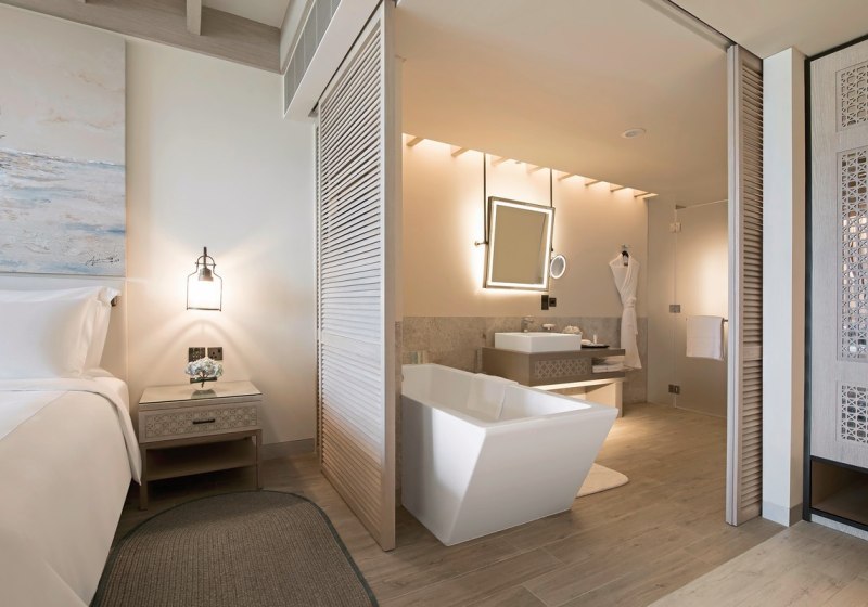 Ihr wählt zwischen Garten-, Resort- oder Meerblick. Für Familien stehen zwei Doppelzimmer mit Gartenblick und gemeinsamem privaten Flur bereit; eine Verbindungstür im Zimmer ist nicht vorgesehen. Bei den Betten habt Ihr die Wahl: King Size, zwei Queen Size oder zwei Einzelbetten. Neben den Zimmern ergänzen Suiten und 13 Beachfront-Villen das Portfolio – für alle, die mehr Raum oder ein eigenständiges Ambiente bevorzugen.