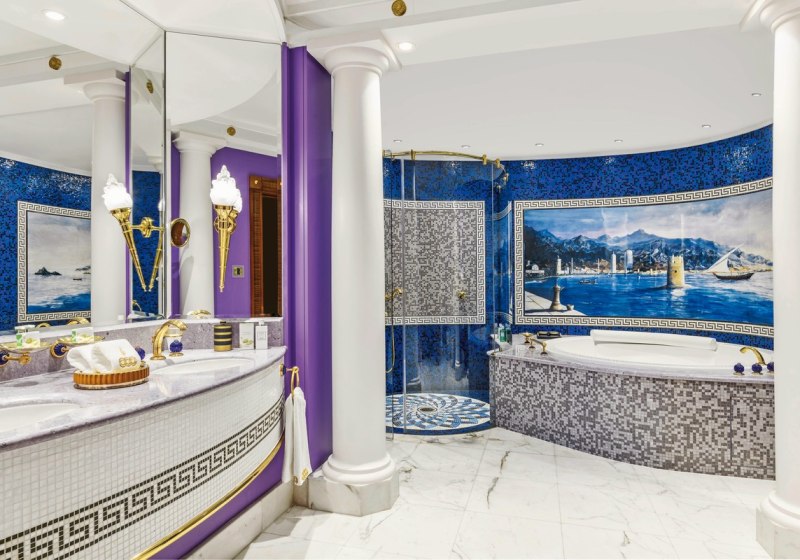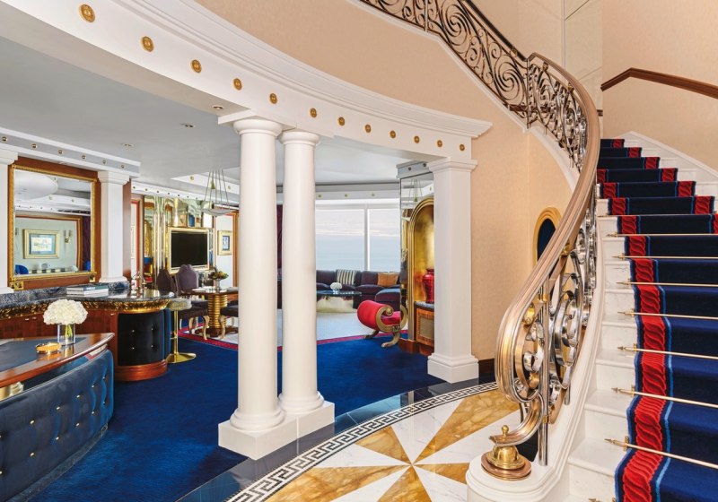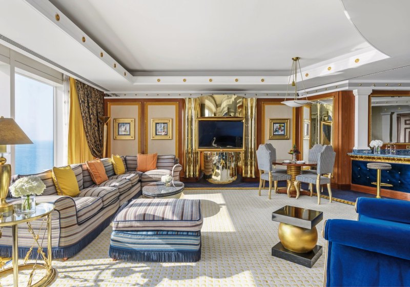 Ihr wohnt in Duplex-Deluxe-Suiten ab etwa 170 Quadratmetern über zwei Ebenen, mit Wohnzimmer, Essbereich samt Bar, Schlafzimmer und Ankleide. Der Meerblick prägt den Raum, zwei große TVs und eine Minibar ergänzen den Komfort. Ein 24-Stunden-Butlerservice begleitet diskret Eure Abläufe.