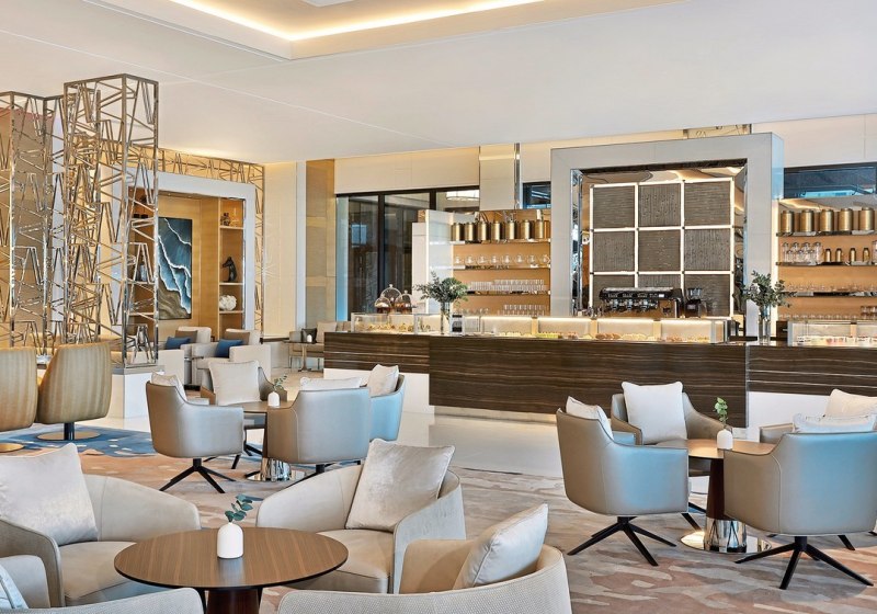 Marriott Resort Palm Jumeirah, Dubai empfängt Euch direkt an der Palm West Beach mit klarer Struktur, frischem Design und viel Raum für entspannte Tage am Meer. Ihr startet in weitläufigen öffentlichen Bereichen mit dezentem Komfort, kostenlosem WLAN und Blick auf den Privatstrand. Die Atmosphäre wirkt modern, ohne aufdringlich zu sein, und richtet sich an Strandliebhaber, Familien und Geschäftsreisende gleichermaßen.