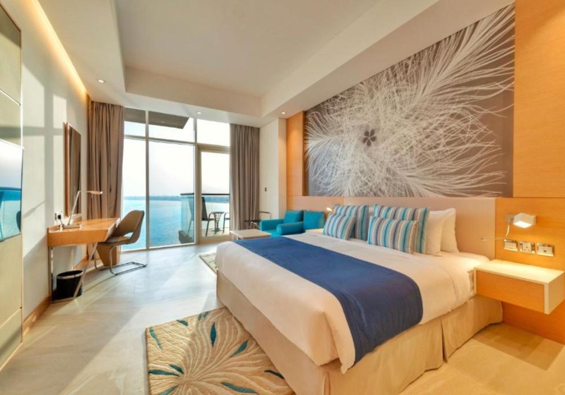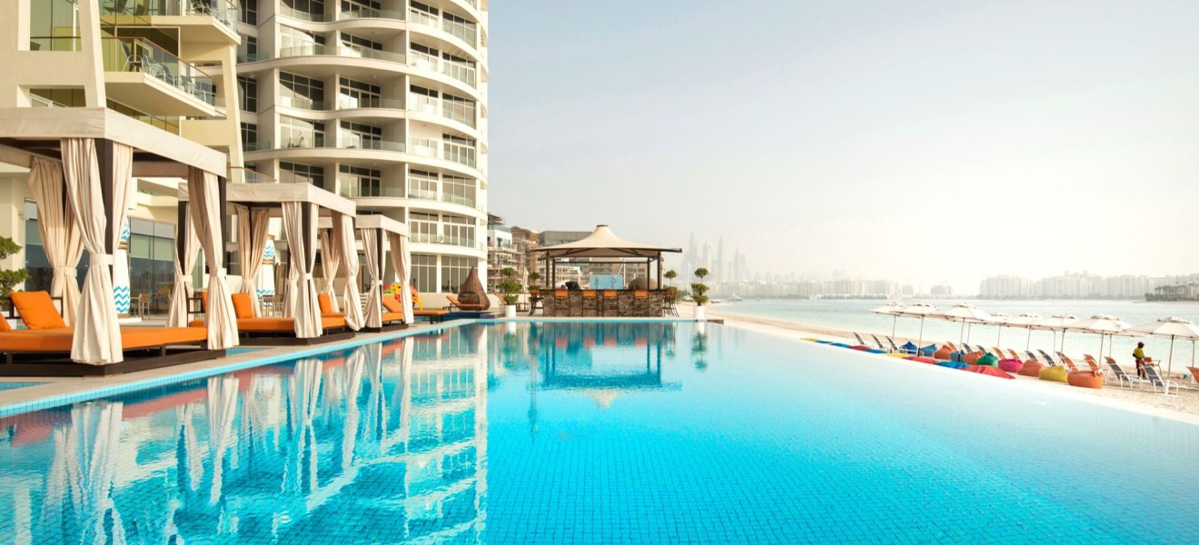 Im Royal Central Hotel - The Palm wohnt Ihr direkt am Privatstrand des östlichen Bogens der Palm Jumeirah. Der Blick wandert von der hellen Lobby zur Sonnenterrasse und weiter aufs Wasser. Der Tag beginnt am Pool, endet in den Bars oder auf Euren Balkonen – entspannt, klar strukturiert, mit kurzen Wegen. Highlight: Privatstrand auf der Palm Jumeirah, ruhig gelegen und direkt zugänglich.