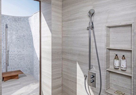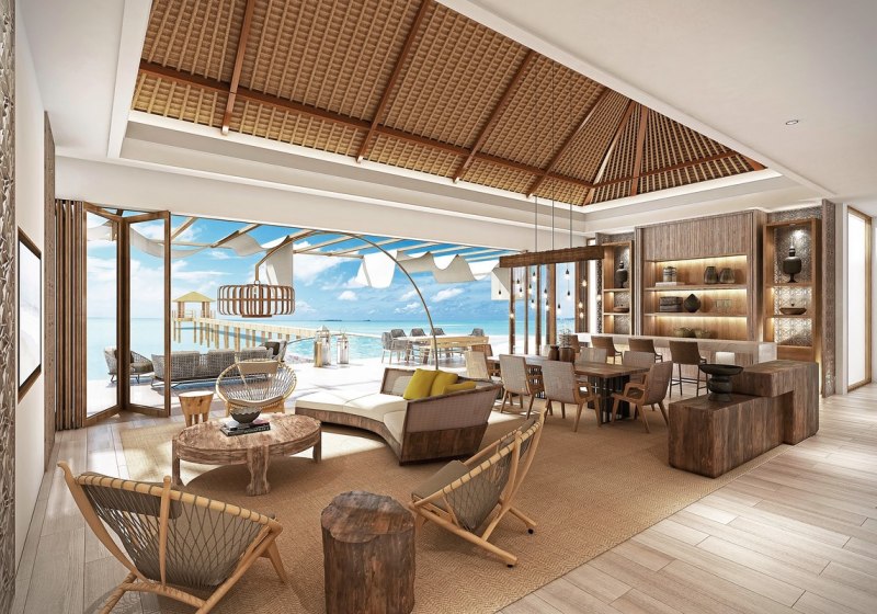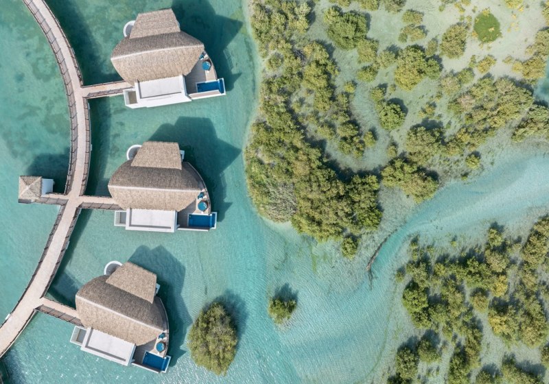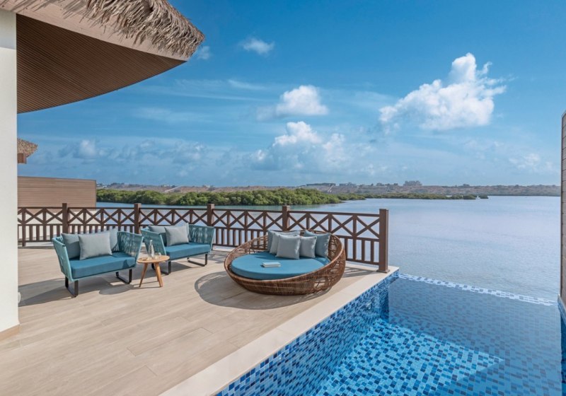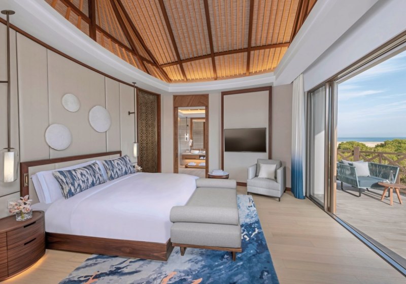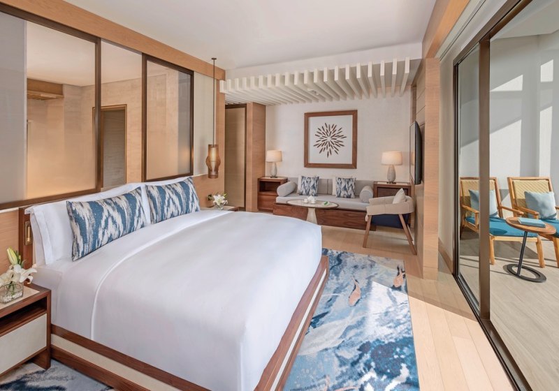 Deluxe Zimmer (ca. 57 m²) bieten möblierte Terrasse in freistehenden Riads. Die Deluxe Suite (ca. 95 m²) ergänzt einen separaten Wohnraum. Peninsula Pool Villa Meerblick (ca. 94 m²) und One Bedroom Overwater Poolvilla (ca. 82 m²) verfügen über privaten Pool und Terrasse. Highlight: Wasservillen mit privatem Pool setzen markante Akzente.