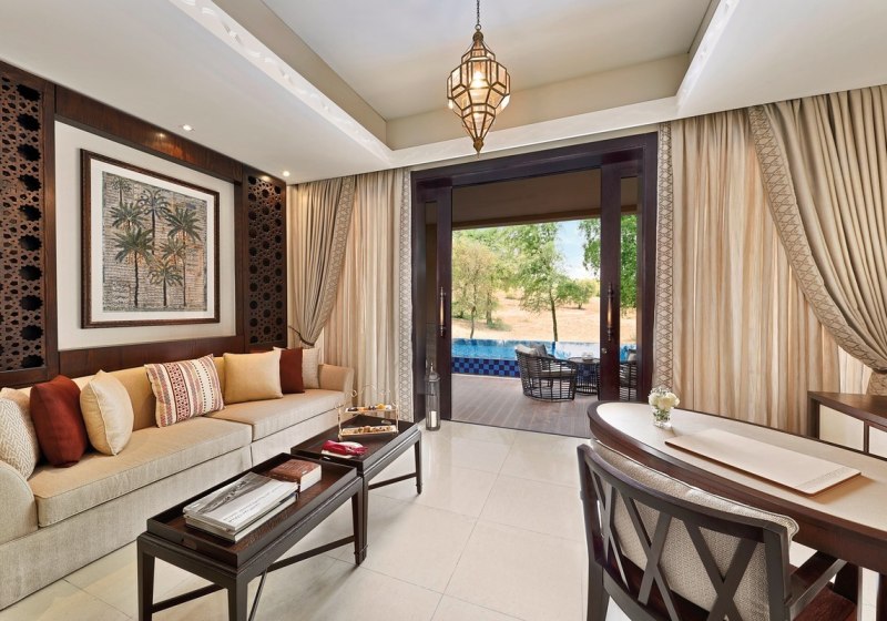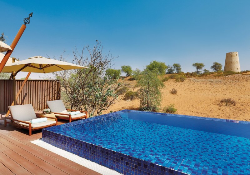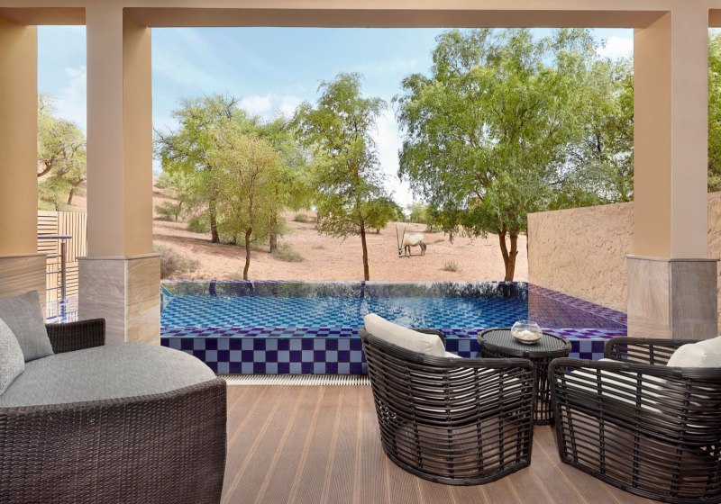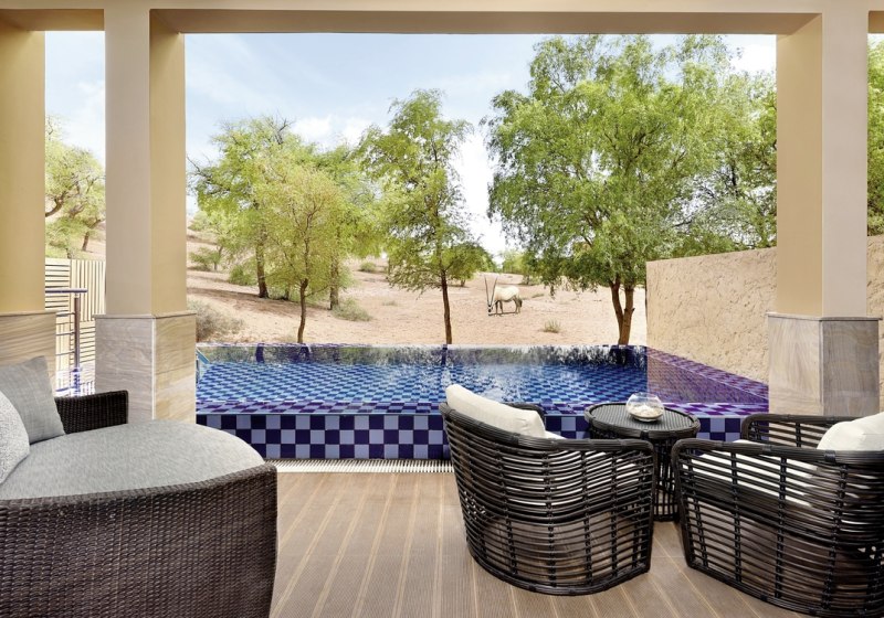 The Ritz-Carlton Ras Al Khaimah, Al Wadi Desert liegt in einem privaten Naturreservat der Wüste von Ras Al Khaimah und verbindet arabische Architektur mit viel Raum und Ruhe. Ihr wohnt in freistehenden Villen mit eigenem Pool und möblierter Sonnenterrasse, bewegt Euch frei zwischen Sanddünen, Gartenbereichen und dem eleganten Hauptgebäude. Das Ambiente ist entschleunigt, die Szenerie weitläufig, die Details durchdacht.