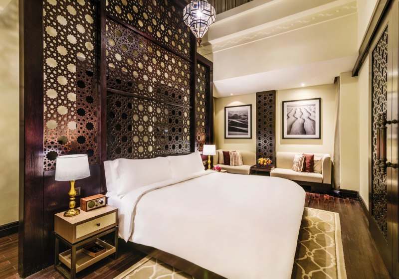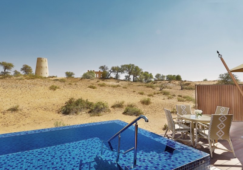 Die Al Rimal Deluxe Pool Villa bietet ca. 158 m² Wohnfläche. Besonders atmosphärisch: die Al Khaimah Tented Pool Villa im Beduinen-Zeltstil mit ca. 253 m². Viele Einheiten verfügen über Balkon oder Terrasse; Ausblicke reichen je nach Lage über Pool- oder Wüstenbereiche. So stimmt Ihr Euren Rückzugsort auf Ruhe, Platz und schöne Abende unter freiem Himmel ab.