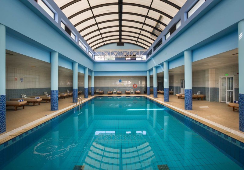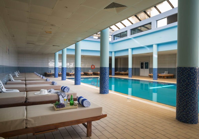• Liegestühle • Hallenbad • Außenpool • Sonnenschirme • Poolbar • Sonnenterrasse • Wasserrutsche • Pool