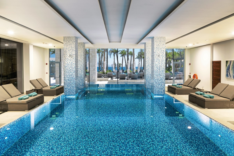 Das Hotel bietet seinen Gästen einen architektonisch außergewöhnlichen Außenpool mit integrierter Poolbar sowie ein Innenbecken für kühlere Tage. Sportliche Urlauber werden sich über den Fitnessraum mit modernsten Geräten freuen.Wellness