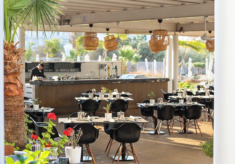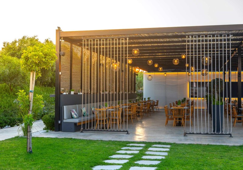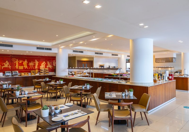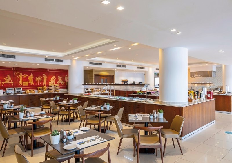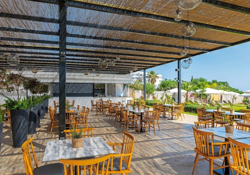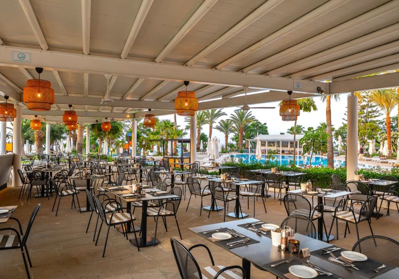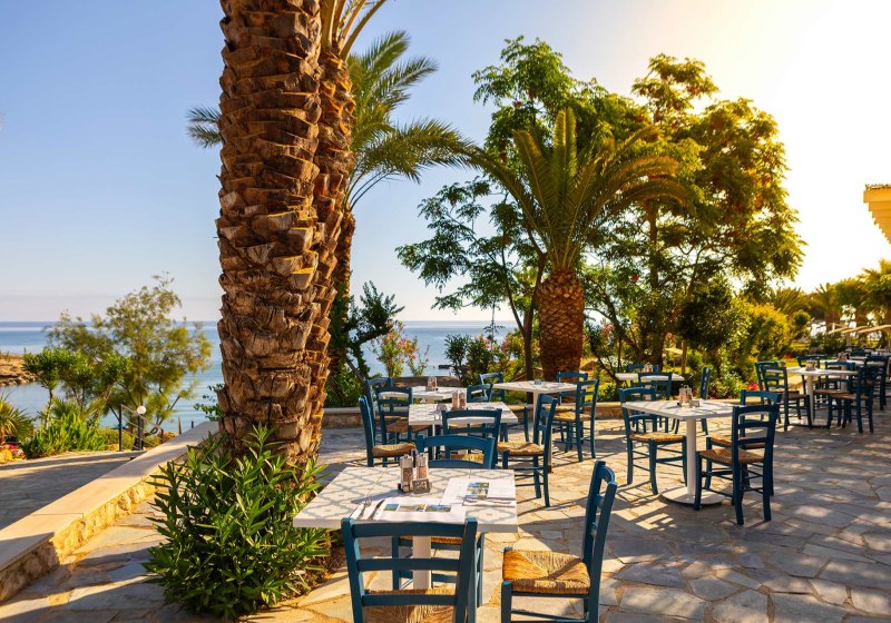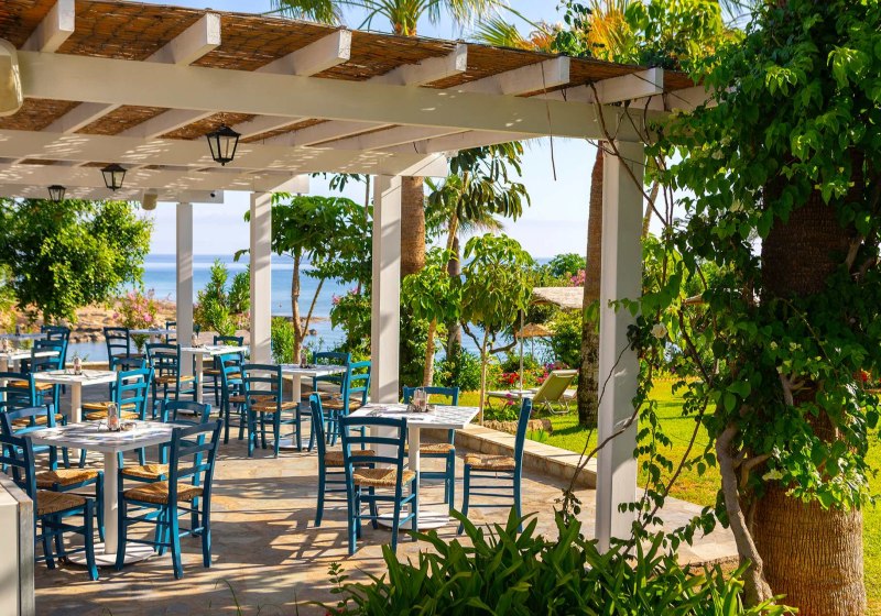 Ihr wählt aus drei Restaurants mit Außenterrasse; dazu kommen mehrere Bars, eine Poolbar und eine Snackbar. Die Taverne „Basilikos“ setzt einen regionalen Akzent in entspannter Umgebung. Verpflegungsoptionen reichen von Frühstück bis All-Inclusive, inklusive vegetarischer Angebote, Kindermenüs und Diätgerichten. Highlight: Drei Restaurants mit Freiluftplätzen.