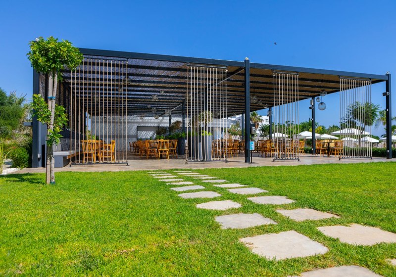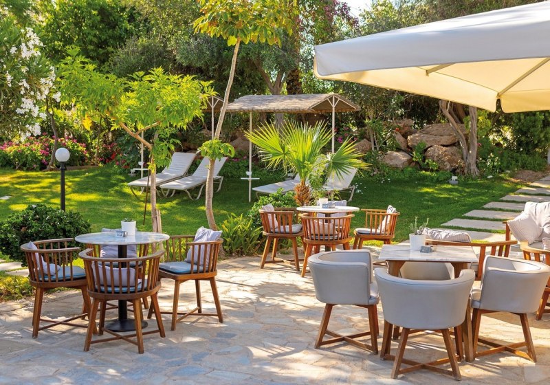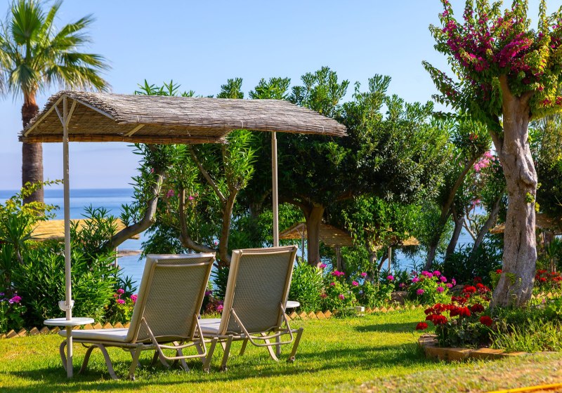 Der Garten ist terrassenförmig bis zum Meer angelegt, der Strand liegt direkt unterhalb. Strandservice steht gegen Gebühr zur Verfügung. Für Familien gibt es einen Spielplatz. Parkplätze sind nach Verfügbarkeit vorhanden. Highlight: Terrassengarten mit direktem Übergang zur Sandbucht.