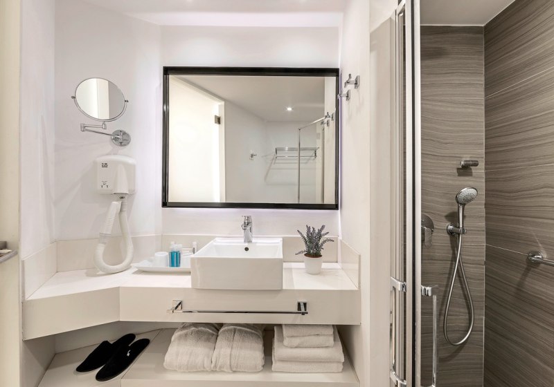 Die Zimmer bieten praktische Details für entspannte Tage: Dusche/WC, Föhn, Bademäntel und Slipper sowie eine Strandtasche. Klimaanlage, Telefon, Sat-TV, WLAN, Safe und Minikühlschrank sind an Bord; dazu ein Kaffee-/Teezubereiter. Bei den meisten Kategorien gehört ein Balkon dazu. Highlight: Durchdachte Basics inklusive Strandtasche.