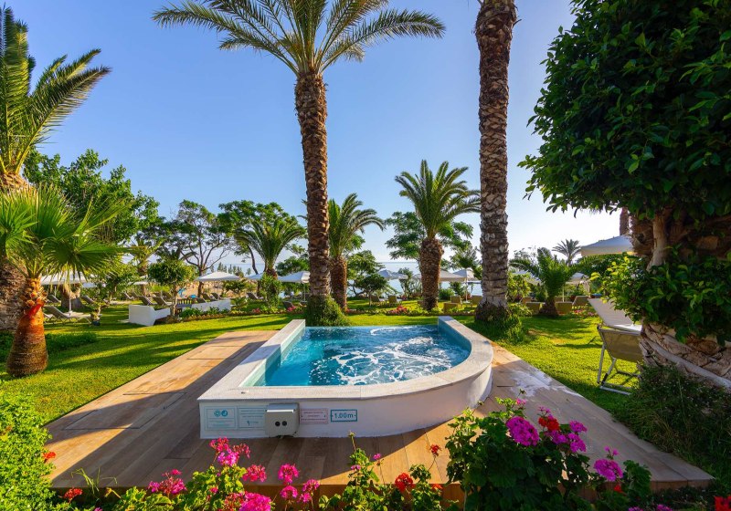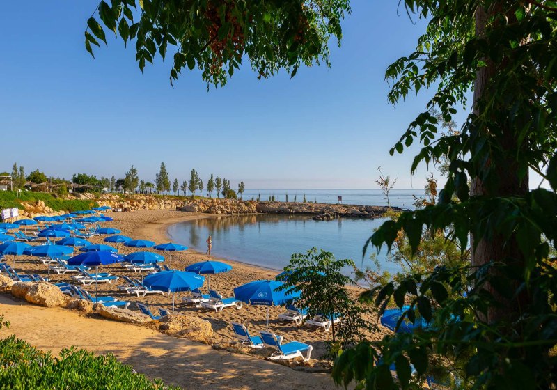 Im Crystal Springs Beach Hotel wohnt Ihr direkt über einer kleinen Sandbucht von Protaras. Terrassenförmig fällt der Garten zum Meer ab, dazwischen liegen Pool, Sonnenterrassen und schattige Plätze. Die Anlage wirkt übersichtlich und entspannt, mit klaren Wegen zwischen Lobby, Restaurants und Strandzugang. Highlight: Terrassengarten bis zur Bucht, kurze Wege in alle Bereiche.