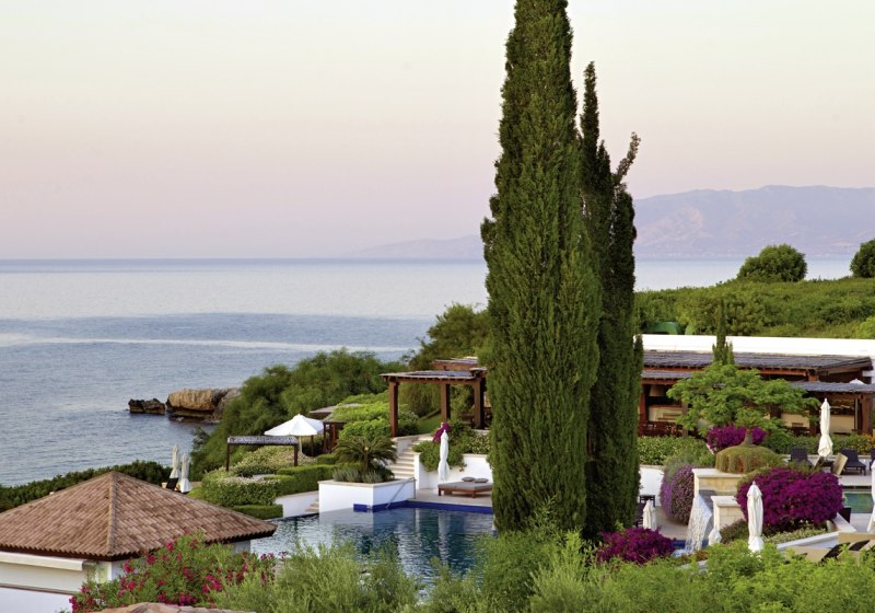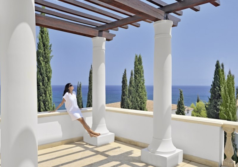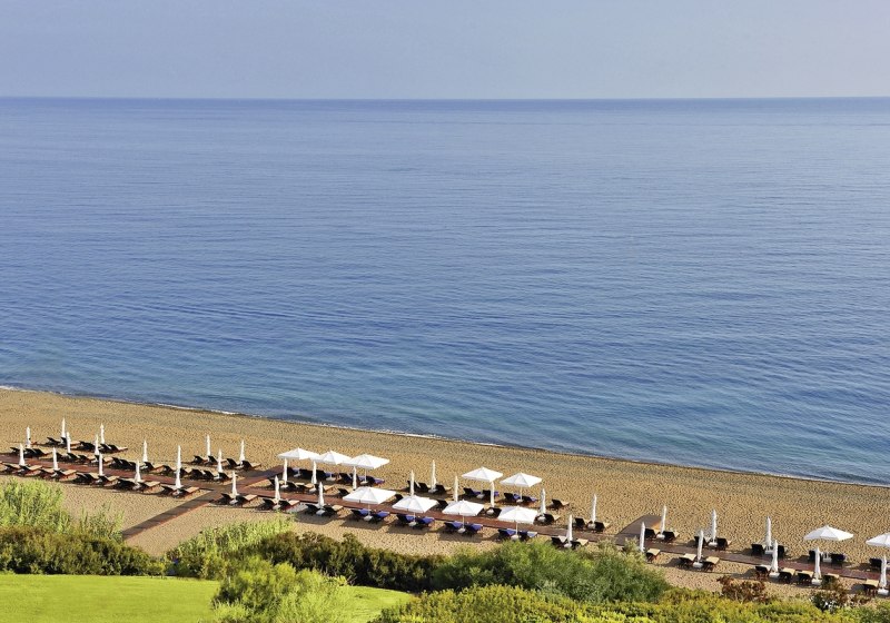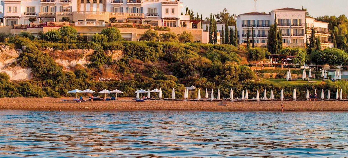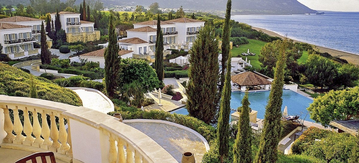 Anassa empfängt Euch an der Chrysochou-Bucht mit direkter Strandlage und dem Blick auf das nahe Akamas-Naturschutzgebiet. Die Anlage ist im Stil eines weiß getünchten byzantinischen Dorfes gestaltet – mit Gassen, Sitzterrassen und ruhigen Ecken, die sich wie kleine Plätze anfühlen. Ihr bewegt Euch zwischen Sonnenterrassen, Liegewiesen und zwei großzügigen Pools, während Meer und Garten stets präsent bleiben.