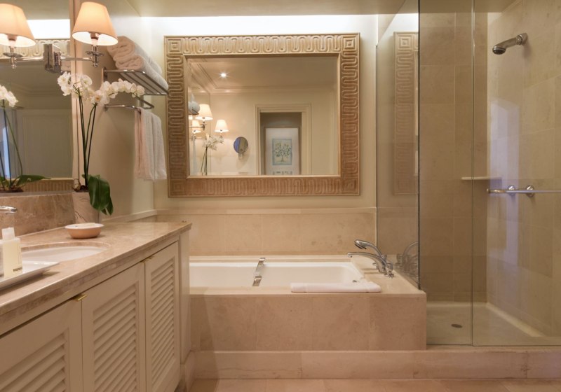 - Komfort-Setup: Marmorbad mit separater Dusche, Espresso-Maschine und Minibar.