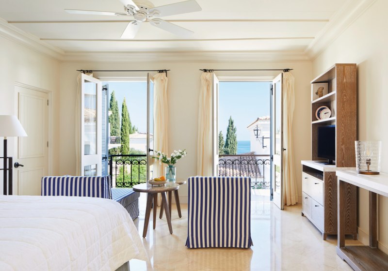 166 Zimmer und Suiten verteilen sich auf Haupt- und Nebengebäude. Das Design setzt auf klare Linien und Naturtöne, während Balkon oder Terrasse den Außenraum öffnet. Marmorbad mit separater Dusche, Bademantel und Slipper sorgen für komfortable Routinen; Espresso-Maschine und Minibar runden ab.